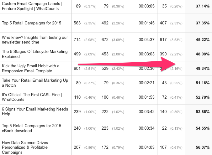 What does that mean? It means send amazing email, but with the right goal in mind. Goals change from marketing team to marketing team, but for the sake of this guide, lets say our measurement of success is getting that click through to the website. This is seen as a form of engagement and we’ll track pageviews, bounce rates, and exits as our metrics using Google Analytics.